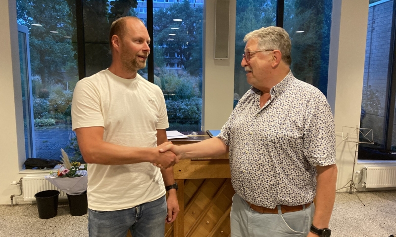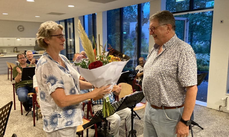 Op de eerste repetitie van het nieuwe seizoen was er heel wat te vieren. Voorzitter John van Halderen feliciteerde penningmeester Henny van Eck met zijn 25-jarig jubileum. Hij ontving twee oorkondes, een speldje van het Koninklijk Nederlands Zangersverbond en natuurlijk bloemen. Het andere boeket was voor Madelon de Koning die haar tweede lustrum viertde als koster van kerk De Bron, onze thuisbasis. Tot slot kon Van Halderen een nieuw lid installeren: Michiel de Kok (bas) die met zijn 48 jaar de gemiddelde leeftijd aardig verjongt.